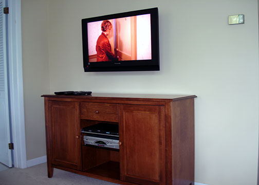 A straightforward install with panel securely mounted and wires concealed in the wall connecting cable box and DVD player in the cabinet below.