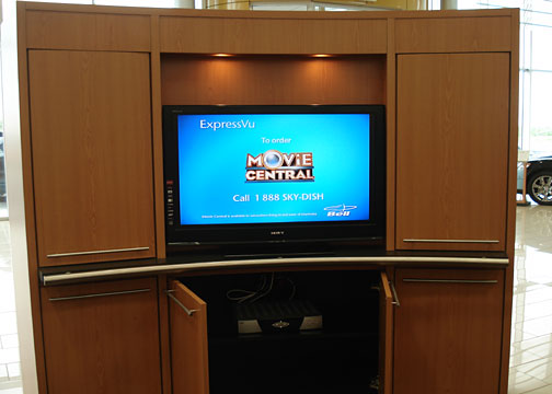 The TV securely mounted with concealed satellite receiver in a cabinet at the Toyota Dealership.