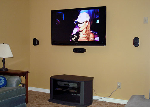 A typical installation consisting of TV panel mounted on the wall, two sources including cable box and DVD, with surround sound and cables concealed.
