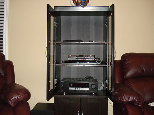 Each equipment piece (cable box, receiver, DVD) has been outfitted with an IR transmitter receiving signals from the main eye installed beneath the TV at the front of the room.  This allows the cabinet to be closed and equipment conveniently controlled without having to directly point the remote.