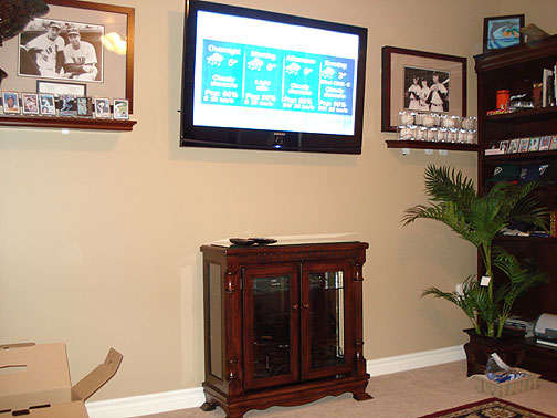 The secure mounted flat panel with wires concealed and equipment hidden away in a cabinet below.